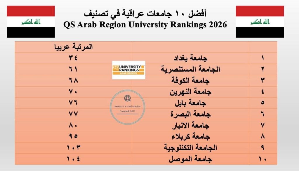 تواصل جامعة البصرة تعزيز مكانتها الأكاديمية والبحثية بين الجامعات العربية، بعد دخولها مجددًا ضمن تصنيف QS Arab Region University Rankings 2026، الذي أصدرته مؤسسة QS العالمية.