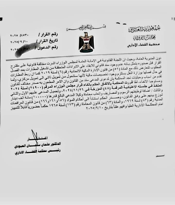 وأكدت أنه في حال عدم الاستجابة لمطالبهم وتنفيذ الحكم القضائي، فإن منتسبي المطارات سيتجهون إلى إيقاف العمل في عموم المطارات العراقية خلال الفترة المقبلة .