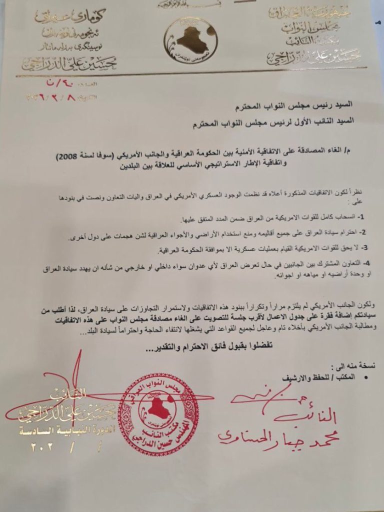 ويأتي هذا الحراك النيابي رداً على ما وصف بتكرار التجاوزات على السيادة العراقية وعدم الالتزام ببنود الاتفاقية، مع التأكيد على ضرورة الإخلاء التام والقريب لكافة القواعد العسكرية الأجنبية، استناداً إلى مبادئ السيادة الوطنية الكاملة وحماية أمن واستقرار البلاد.